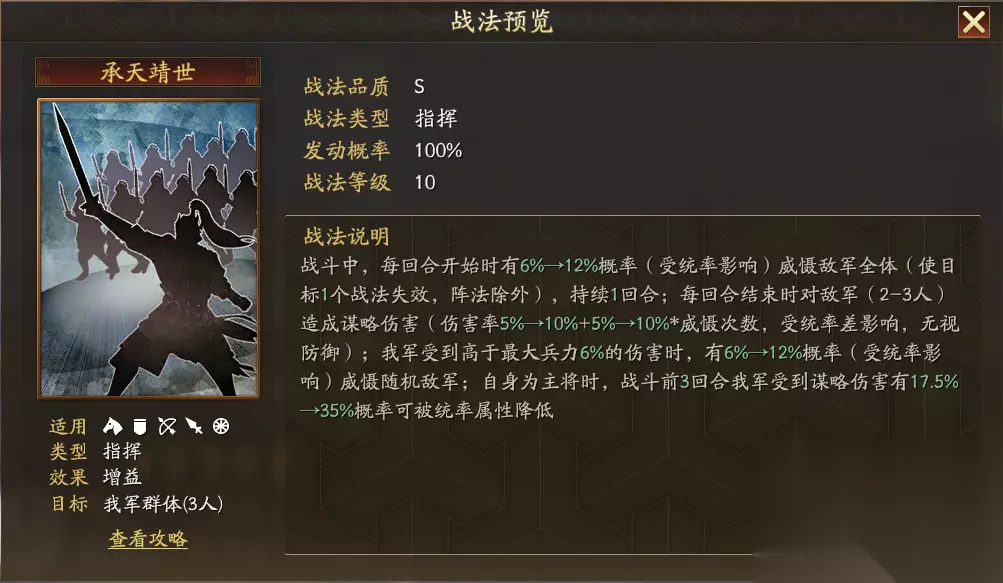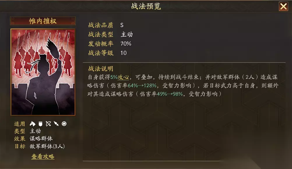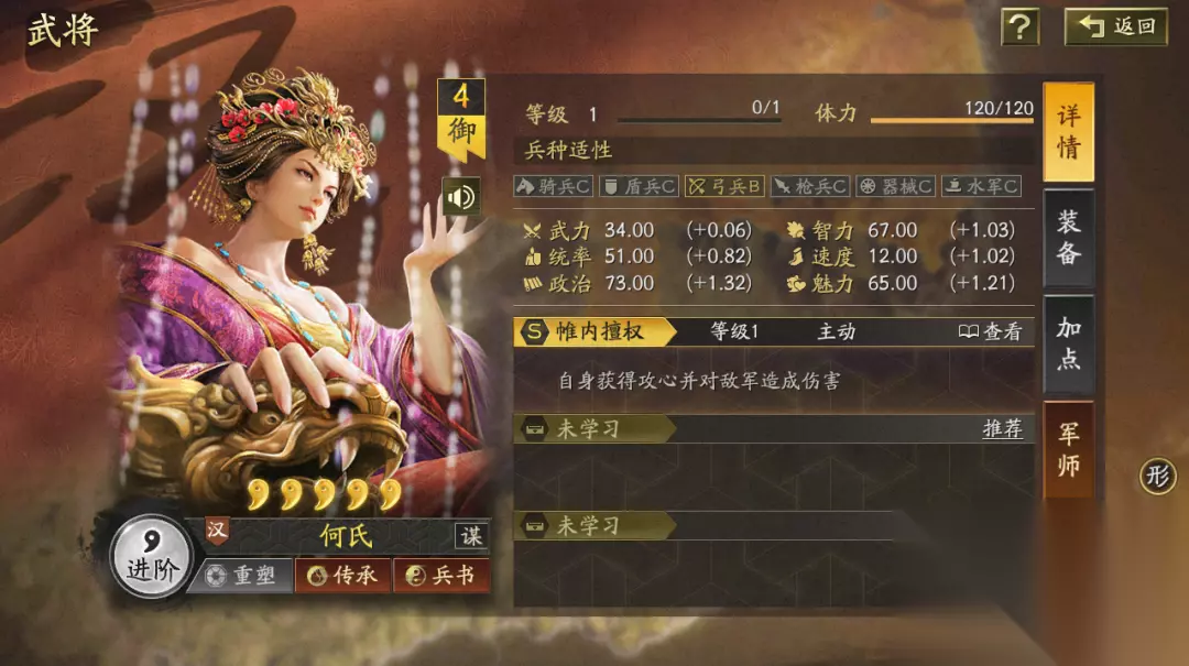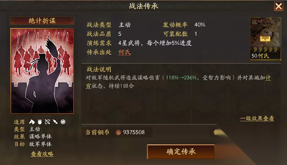 何氏深谙宫闱权谋,可对敌军群体施加高额谋略伤害,并随战斗推进不断叠加攻心效果;若目标武力高于自身,则伤害大幅提升,专克勇猛之将,以智制力。 传承战法绝计折谋