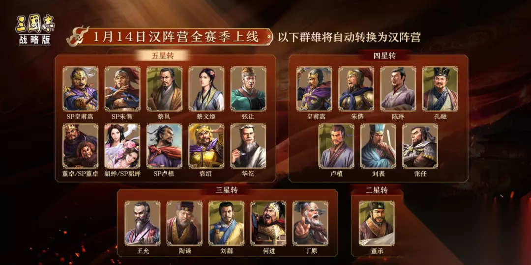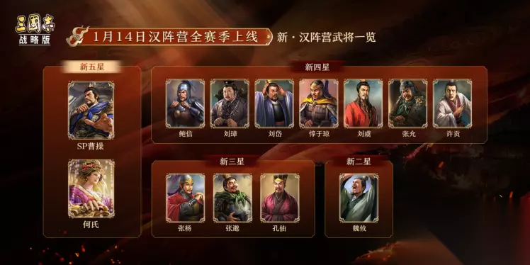 每回合,由我军属性最优者代行职责——魅力最高者提供疗伤,统率最高者破敌智谋,武力最高者斩将夺旗,三人分工明确,协同作战。 1月14日,汉室阵营全赛季登场 魏、蜀、吴的英雄们,最初都曾站在“汉”的旗帜之下。曹操以此立身,刘备以此聚义。没有“汉”,便没有三国的序章,四百年的汉室江山,不仅是地图上的疆域,更是天下人心中“秩序“与"正统”的象征。它是曹操"挟天子以令诸侯"的资本,是刘备“皇叔”身份合法性的来源,是孙权接受册封的权力依据。天下英雄,皆在此局中。 而“匡扶汉室”,更是一面凝聚了无数理想与悲情的旗帜。它既是皇甫嵩、朱儁受命于危难,率孤军平定黄巾的忠诚,也是卢植独持清议维护朝纲的士人风骨。这面旗帜下,汇聚了忠诚、权谋、理想与无奈,写就了最为荡气回肠的英雄史诗,缺少了“汉”,三国的故事是不完整的。 因此,我们设计“汉”阵营,并重新妥善归属了一批极具人气但此前无法有效定位的核心人物,例如: 早期的曹操:挟天子以令诸侯,新赛季将以“汉臣”的身份率先登场。 何氏:帷幕之后密谋全局 皇甫嵩、朱儁:平定黄巾之乱的名将。 这些武将的阵营变化也更加还原了游戏的历史叙事,希望主公们可以与他们一同守护汉焰长明。 汉阵营武将一览 汉阵营的武将在1月14日更新后,以下群雄武将会自动转换为汉阵营。
