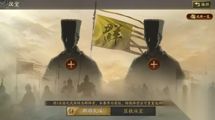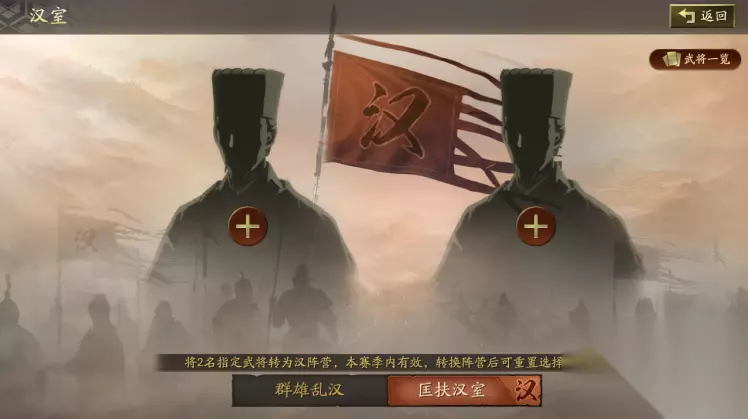 上线后自动转变为汉阵营的武将中,可挑选2名武将转回群雄阵营,而其他与汉相关的武将,也可任选其二,匡扶汉室。