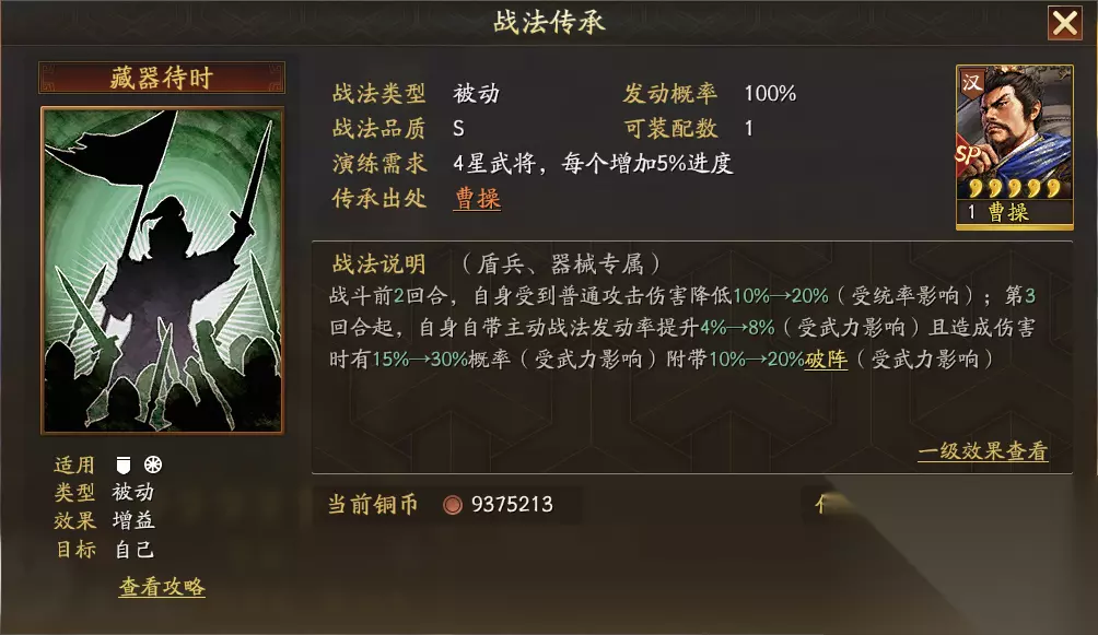 SP曹操奉天命以安乱世,可在战斗中持续威慑敌军,使其随机战法失效;同时可根据威慑次数反制敌人,造成额外谋略伤害。若为主将,更能大幅降低我军前三回合所受谋略伤害,攻守兼备,稳如磐石。 传承战法藏器待时