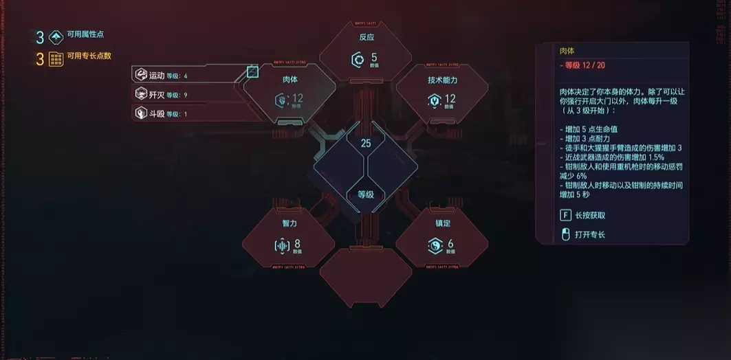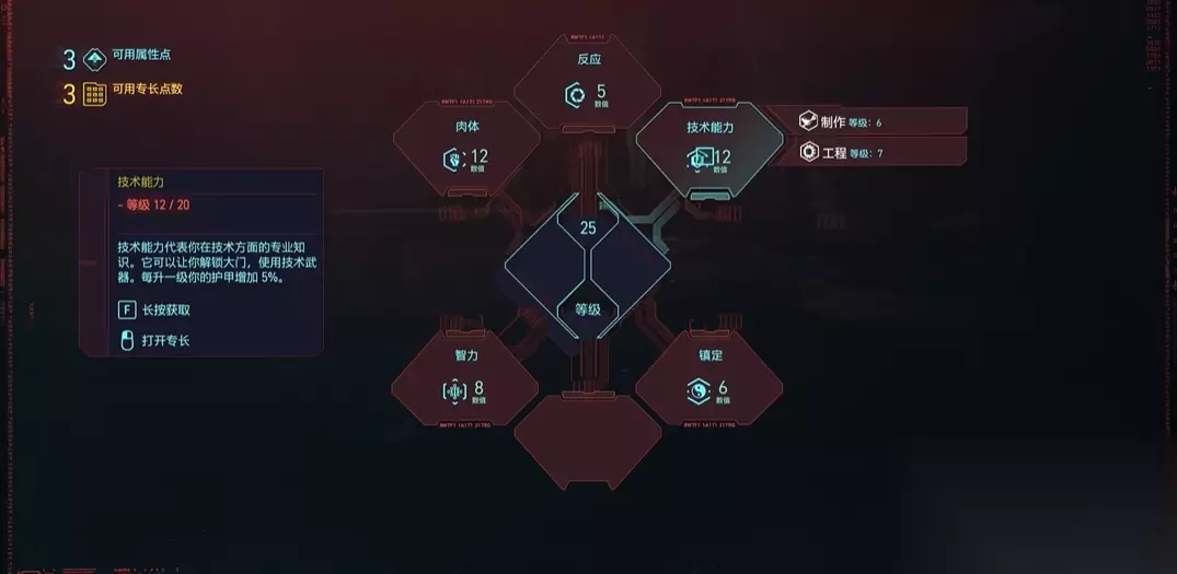 肉体与技术能力作为辅助属性,分别从生存和装备维度巩固枪械流派的战斗力。肉体属性直接增加生命值上限与近战伤害,虽然主打远程,但夜之城的战斗环境复杂,较高的生命值能有效避免被瞬间击倒,提升容错率。一些强力的战斗义体有最低肉体属性要求,达到标准才能安装。技术能力的作用主要体现在两个方面,一是提供额外的护甲值增强防御,二是解锁制作系统。高等级的技术能力允许你制作传奇品质的武器和装备插件,并能打开游戏世界中许多需要技术能力检查的门,从而获取更多资源或捷径。对于依赖武器性能的流派而言,自己打造顶级枪械是后期提升实力的关键途径之一。