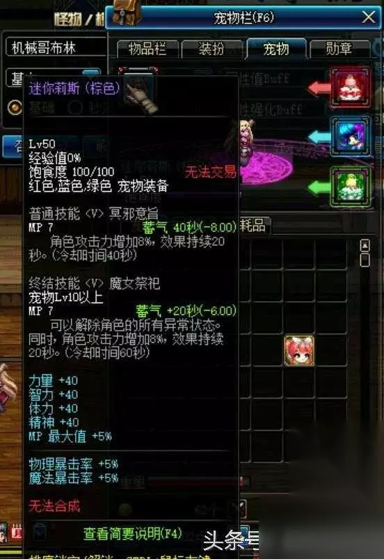 DNF免费宠物迷你莉斯宠物属性逆天,buff全程持续,支持换宠物 很久以前哥特萝莉活动做的免费宠物,当时一直在带,但是没试用过宠物技能,一个月发现,宠物技能buff显示持续20冷却40,但实际确是全程持续,不退图buff不掉。下面放图 宠物属性