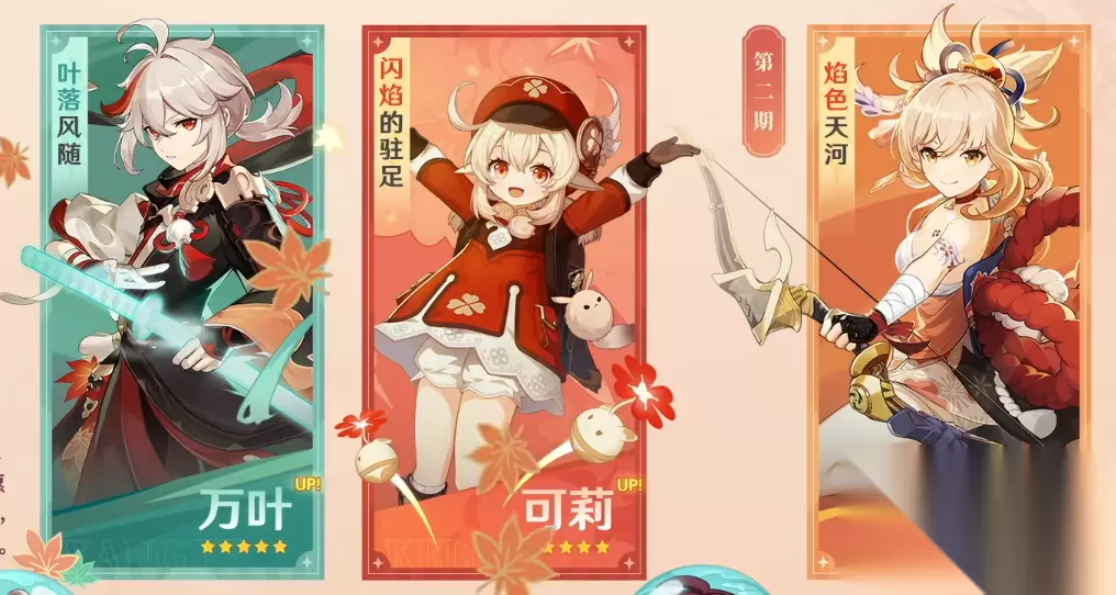 第一期为万叶和可莉,第二期是宵宫 同时新四星角色鹿野院平藏将会在第一期卡池中与可莉和万叶一同UP