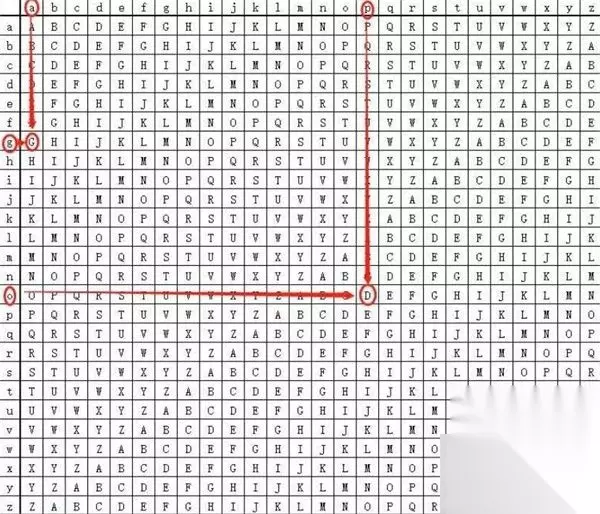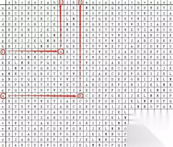 个字母a,密钥是g,从行找到字母a,从左侧的列找到g表格内由a和g相交的字母为G。 第二个字母p,密钥是o,从行找到字母p,从左侧的列找到o,表格内由p和o相交的字母是D。 第三个字母p,密钥是d,从行找到字母p,从左侧的列找到d,表格内由p和d相交的字母是S。 第四个字母l,密钥是g,从行找到字母l,从左侧的列找到g,表格内由l和g相交的字母是R。 第五个字母e,密钥是o,从行找到字母e,从左侧的列找到o,表格内由e和o相交的字母是S。 因此,密文应为gdsrs 第二关 问题:请把“密文:bqxugbk 密钥是:qin”此题的完整明文写出。(请输入密文 例如:7个字母不区分大小写) 答案:likeyou 解析: 对照表格: