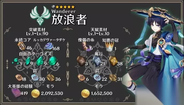 《原神》散兵流浪者突破及天赋材料介绍 如下图所示:
