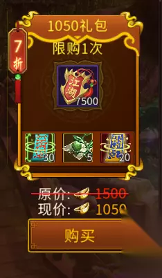 5、1050元宝档位 可获取:30土灵符、5悟神丹、20个加成功率百分之20的幸运符、7500江湖令
