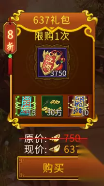 2、637元宝档位 可获取:15土灵符、30万银两、10个加成功率百分之10的幸运符、3750江湖令