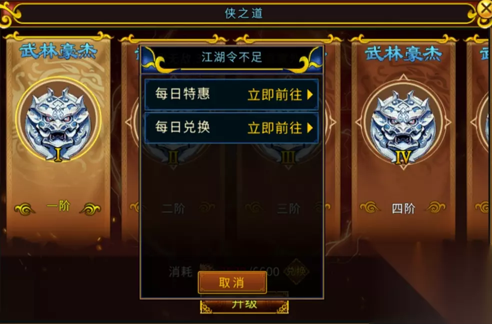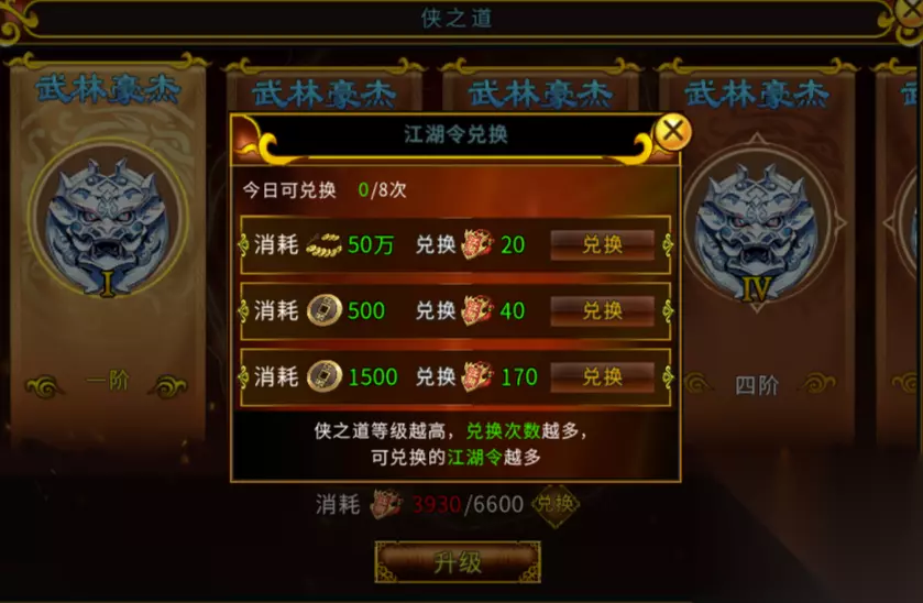 提升途径: 接下来我们来讲讲侠之道的提升途径,侠之道的提升,主要依赖"江湖令"为主。