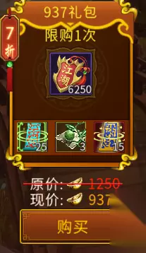4、937元宝档位 可获取:25土灵符、3悟神丹、15个加成功率百分之15的幸运符、6250江湖令