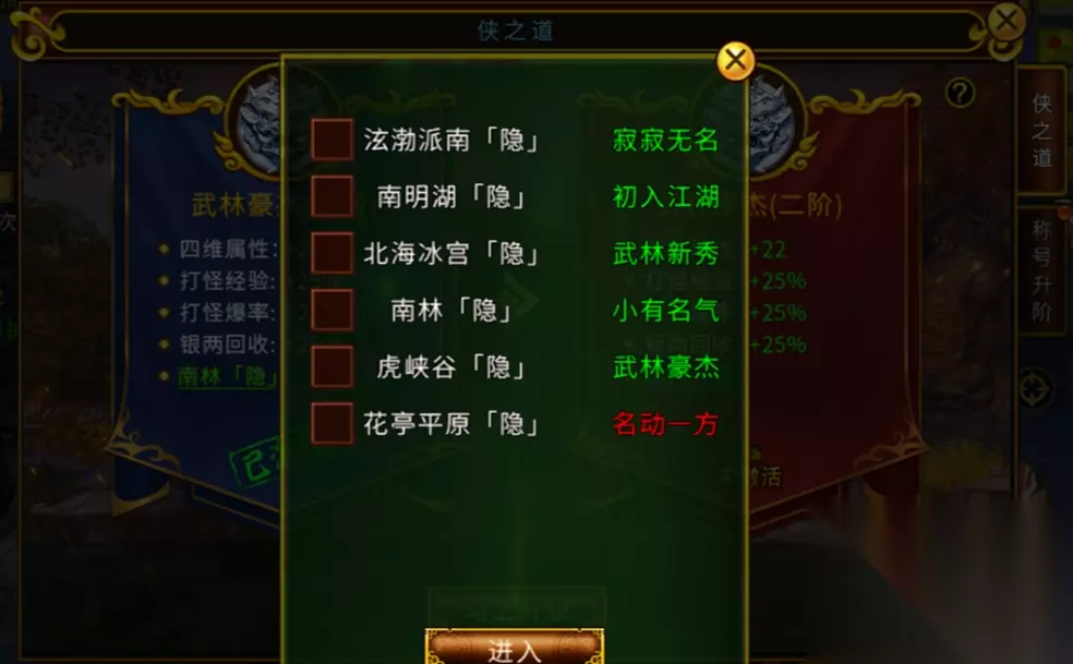 此外侠之道每达到一个新的阶段,能去的隐藏地图也不同 寂寂无名--泫渤派南[隐] 初入江湖--南明湖[隐] 武林新秀--北海冰宫[隐] 小有名气--南林[隐] 武林豪杰--虎峡谷[隐] 名动一方--花亭平原[隐]