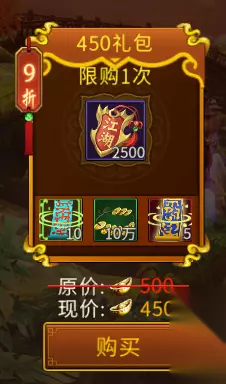 2、每日特惠 每日兑换功能需要付费花元宝购买,如果是0氪玩家就可以不用考虑了,氪金玩家按实力兑换,氪佬玩家随意,每日特惠共分五个档位的礼包 1、450元宝档位 可获取:10土灵符、10万银两、5个加成功率百分之5的幸运符、2500江湖令