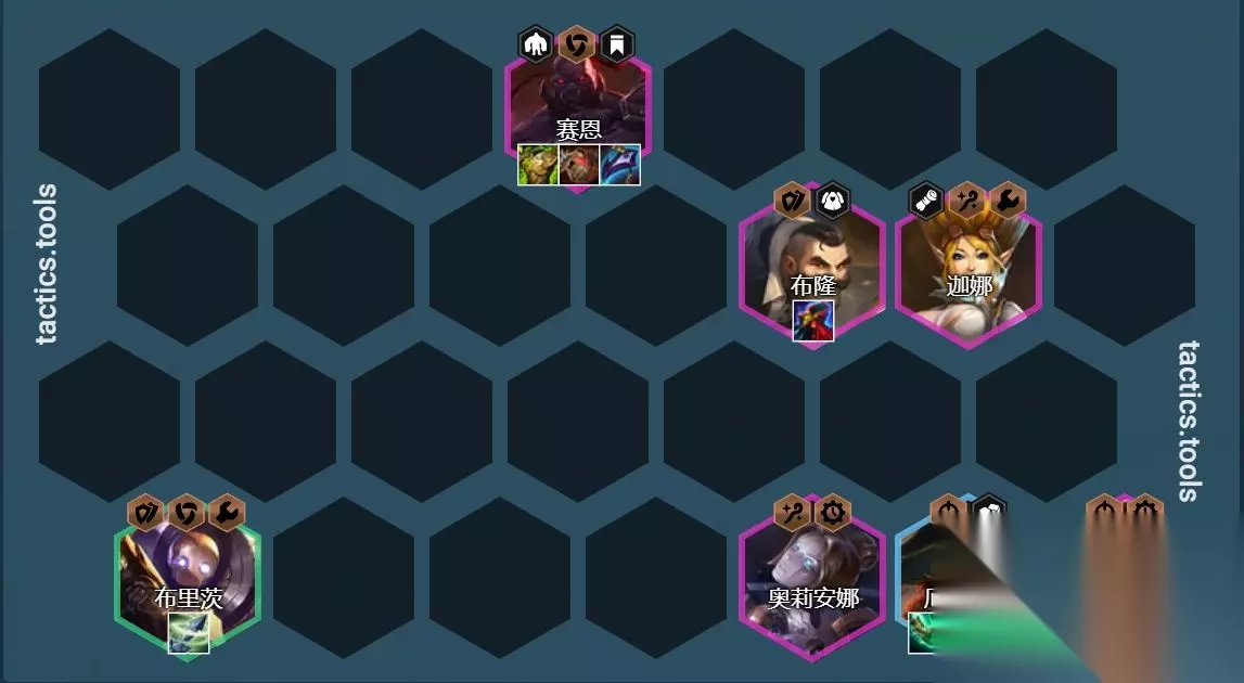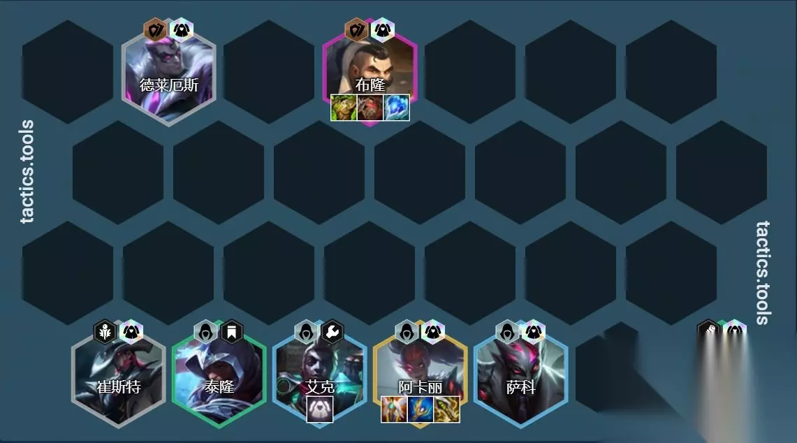 相关改动: 并肩作战 AD&AP提升:3/4/5 >>> 2/3/5 奥莉安娜 法力值:50/140>>> 50/130 赛恩 技能晕眩时间:2/3/6秒 >>> 2.5/3/6秒 技能伤害:100/200/500 >>> 125/200/500 狙神阵容虽然回调了并肩作战的并肩作战的强度,但是发条的最大法力值减少了,技能释放频率增加,以及塞恩的控制时间和技能伤害都提升了,总的来说狙神体系都是加强了。特别是在没有并肩作战的情况下,基本是版本T0级别的阵容,当然这个强度主要依据辛迪加刺客阵容的多少来决定,迪加刺客越多狙神的强度也会越低,没有刺客的狙神妥妥的T0。 二、不赌迪加刺 阵容组成:德莱厄斯、婕拉、泰隆、艾克、萨科、布 隆、艾克、阿卡丽、崔斯特 阵容羁绊:7辛德加4刺客2保镖(需一辛德加) 海克斯强化(种族)选择:辛迪加转职、刺客转职、我为人人、割喉之战、烟雾弹、保镖转、直击弱点、DD街区 转职建议:辛迪加转职>刺客转职>保镖转