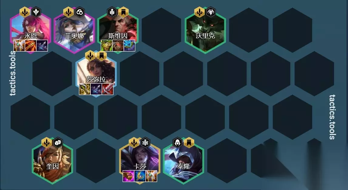 相关改动: 辛迪加 7辛迪加额外提升:33% >>> 50% 新版本更新后追高辛迪加刺,将会成为版本热门的上分思路。而且由于狙神版本依然强势,迪加刺作为狙神阵容尾数不多的克制阵容,登场率也会直接提升。后期就取决于大家是否能够追到2星阿卡丽。 三、帝挑莎弥拉 阵容组成:奎因、沃里克、泰隆、斯维因、莎弥拉、永恩、菲奥娜、卡莎 阵容羁绊:6挑战3帝国 海克斯强化选择:挑战转职、+1/2挑战(优先能够凑出6炼金)、飞升(加时赛的王)、星界赐福I/II/III(带有恢复)、人人为我(优先考虑)、亮出架势、短兵之力I/II/III、狩猎律动I/II/III、DD街区、星界赐福、潘朵拉、泰坦之劲、帝国心/魂/转 转职建议:挑战转职、帝国转职