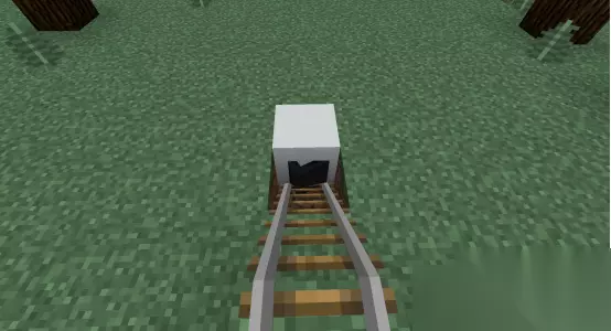 3、在轨道上面放漏斗矿车,滑到坑里的方块上。