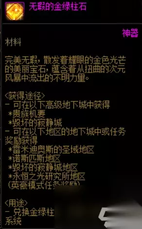 主要通过110级的普通地下城及高级地下城获取,消耗量极大(属性成长一次消耗50个,属性传送一次消耗250个、属性等级转移一次消耗500个),平均一管疲劳普通地下城可获得80~150个左右(根据加百利商店/特殊翻盘的次数导致数量略有不同)。 完成紧急任务/通过高级地下城(贵族机要、毁坏的寂静城)时,可获得无暇的金绿柱石(可交易)。