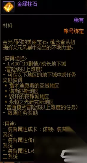 金绿柱石作为DNF110新版本之中最重要的道具,很多小伙伴都不知道如何获取它,为此这里就给各位带来dnf金绿柱石获取攻略! dnf金绿柱石哪里刷 110版本最重要的材料之一,贯穿整个110级版本的材料,装备词条的成长、传送、属性等级转移与装备跨界等等(参考100级版本的堇青石)都需要此材料。