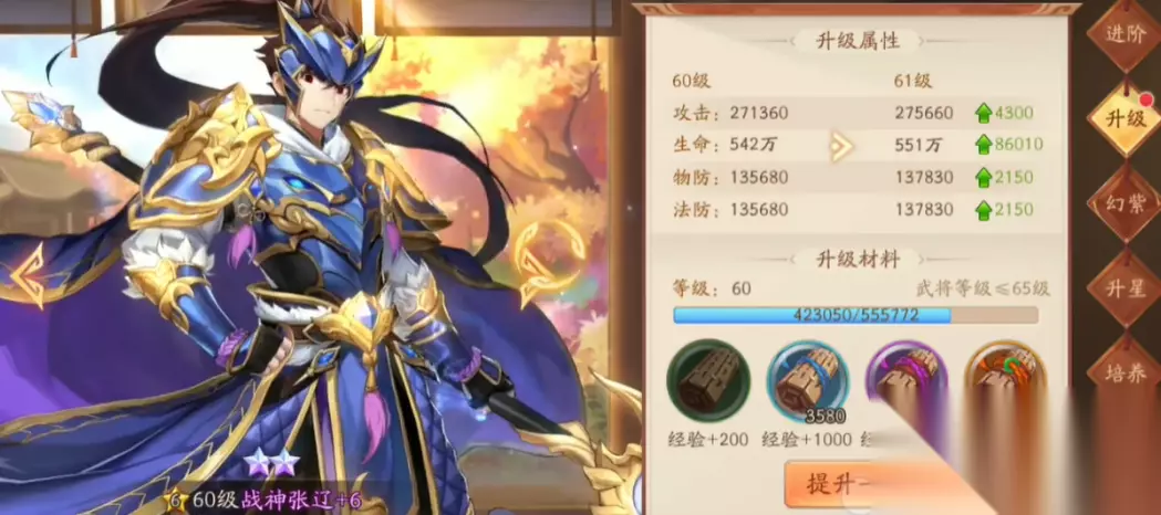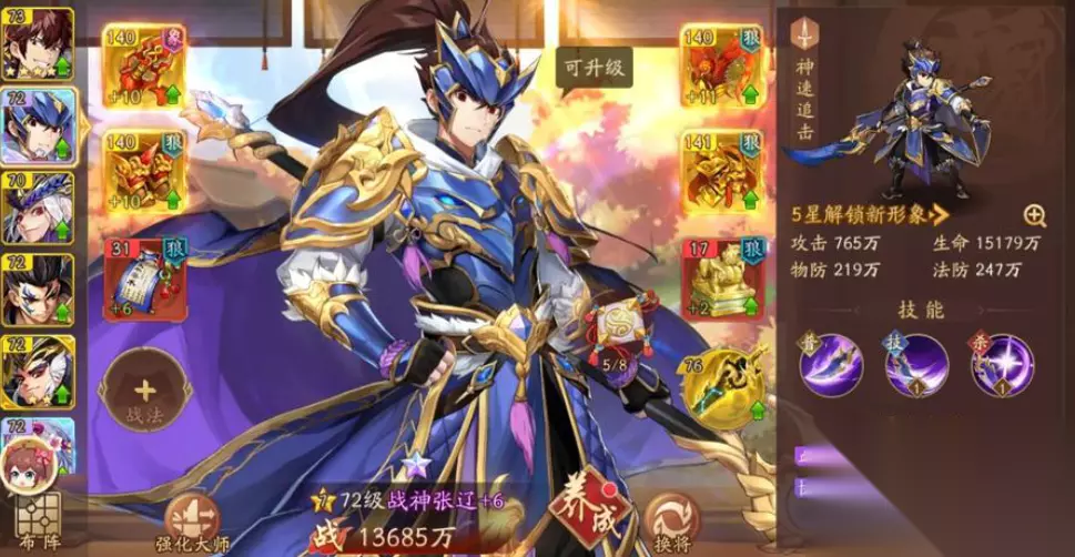 紫金品质后:解锁的「神速」「连击」被动无需手动加点,但需通过技能等级激活前置条件 —— 满级怒气技能可提高「突袭」触发三倍伤害与怒气回复的概率,形成 "技能释放→怒气回满→二次连击" 的循环。 二、分阶段加点策略:适配成长周期的资源分配 张辽的加点需与培养阶段深度绑定,避免前期资源浪费或后期输出断层。 1. 初期(1-4 星):聚焦核心功能 此阶段资源有限,需集中火力强化关键技能: 优先将「所向披靡」升至 60 级,确保减怒效果稳定触发; 「突袭」提升至 40 级,满足基础输出需求; 被动技能点出「甲骑具装」,强化对近战部队的伤害压制,适配初期推图场景; 天赋优先激活「五子良将」第一层,若搭配夏侯惇、夏侯渊可额外获得攻击加成。 2. 中期(5-7 星):平衡输出与辅助