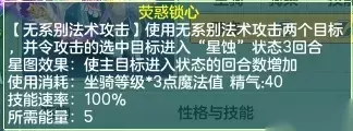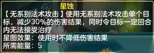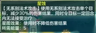 小昕分析: 辰光状态属于特殊状态,而且没有任何副作用,无论是正常使用还是星图状态下使用该技能获得的辰光状态都是实打实的收益(星图情况额外多2回合)。 小昕推荐各位可以在特殊情况下的集火使用该技能顺带获得辰光状态,若是在获得星图状态后不知如何抉择也可以选择该技能。 星蚀、荧惑锁心(禁疗)