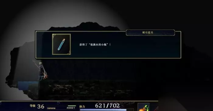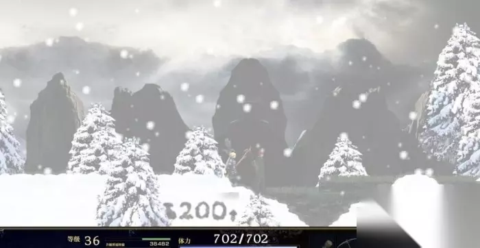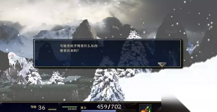 图2 来到雪山都是一条路,走到被山堵住的地方发生剧情,回头有个门可以进一直向右前进会碰到大宝贝商店和存档水晶。下一个区域开始就是暴风雪地带了,这个地带的所有区域因为吹大风所以会让主角一直处于平移的状态,想要减少平移的力度要把适应力提高,要不就是提高自身的装备重量。一直向右走发生剧情,结束后主角被埋在了雪下面,向右走发现受伤的少年,调查之后走到左边互动,打开菜单选择空瓶子尺寸随意接水图2,对着少年使用刚才接到的水,剧情后再接一次水对着少年使用,剧情后返回地面。