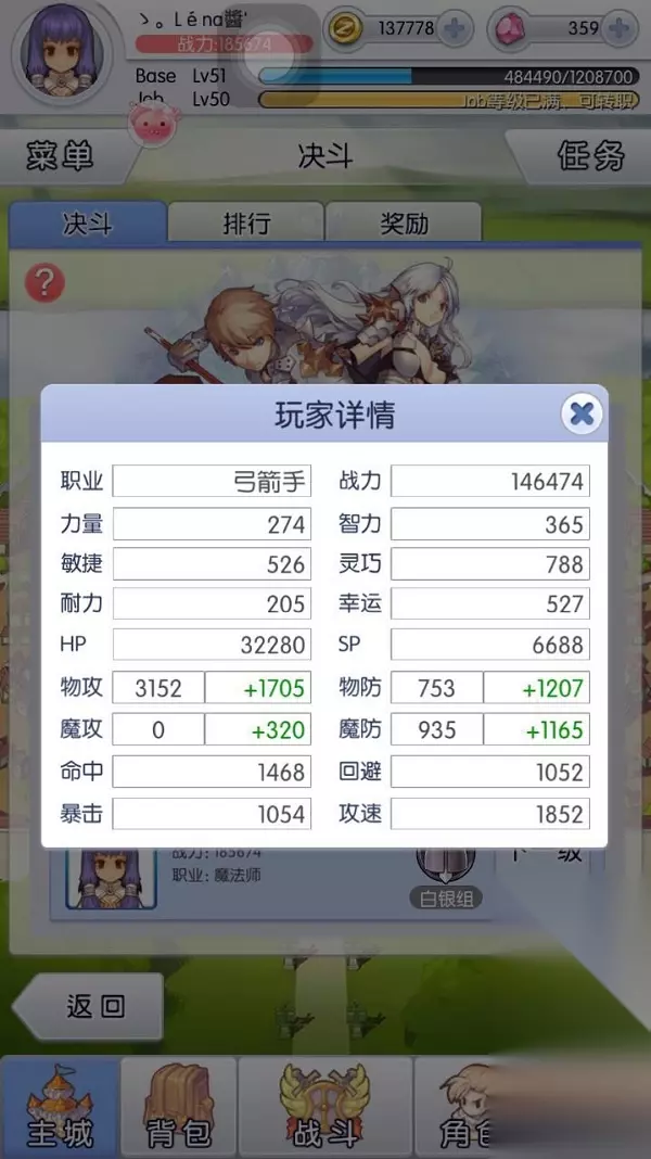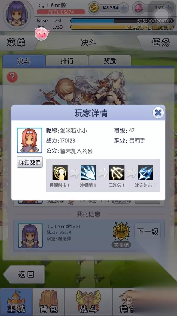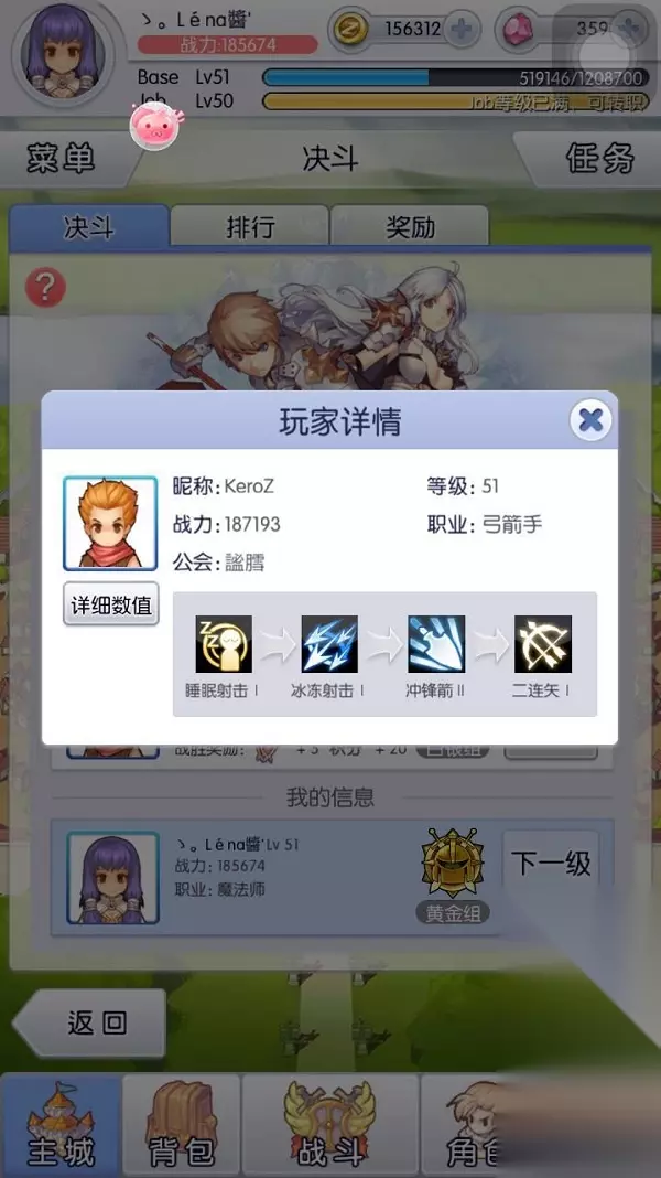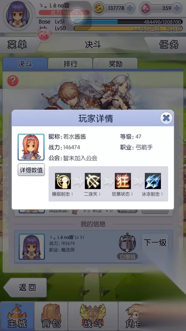 对面带了3个控制技能,所以...就跪了。 少了一场胜率换来给大家做参考的信息,也值得了。 切记,别急于一次性赢5回,有足够的信心取胜才去打,能赢一回是一回,(在我目前测试中来看)因为你配对的对手是服务器已经配好了,隔一天也不回有差。 希望我的小经验可以给大家提供帮助。 追加了一个小技巧,在排行榜里面,点击排行者的头像,也会出现排行者的技能排序和详细数值,可以参考一下他们的技能顺序。