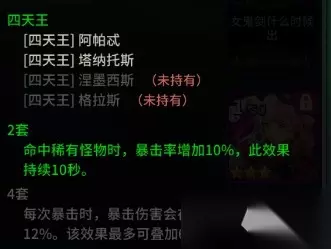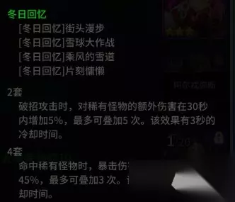 五,卡牌推荐 由于木偶师较为缺少暴击伤害乘区的属性,所以强烈推荐【冬日回忆】套牌,可以很好的弥补木偶师在暴击伤害属性上的缺失,同样【四天王】不光提供【暴击伤害】的增益外还提供10%的暴击率,也是木偶师所或缺的。