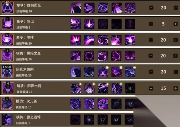 一、技能推荐 【命令:蜂拥而至】点满,可以操控木偶到达指定位置,是最基础的指挥技能。 【命令:突出】点出第二格残像伤害即可,主要功能是破甲和控制,技能点富裕的也可以点满。 【命令:咆哮】点满,集伤害于控制于一身的核心技能,是我们输出的主要伤害来源之一。 【模仿:黑暗之息】点满,点满后可以一直释放,配合阴影木偶剧技能可以同时打出三道光束,伤害很高。 【阴影木偶剧】推荐点满,可以额外放置一个木偶模仿技能释放,可以提高爆发伤害。 【解放:阴影木偶】推荐点满,爆发性BUFF,也可以通过符文和词条调整为常驻,但是过图会消失,所以不推荐常驻。 【模仿:次元斩】推荐点满,短CD的伤害技能,形态很好,是狠心输出技能之一。 【模仿:狼之追悼】推荐点数充足的点满,否则不点,伤害较高但是目前版本减CD失效,修复后推荐点满。