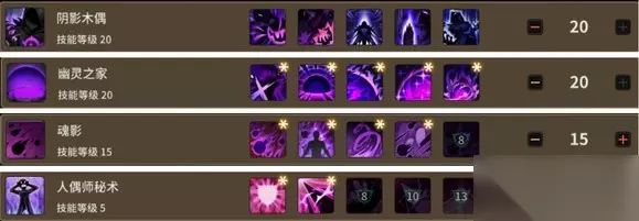 被动技能 【阴影木偶】推荐点满,核心被动之一,直接增加木偶类技能的伤害及自身攻击力。 【幽灵之家】推荐点满配合符文【恐惧跳跃】可增加额外200%的攻击力,是核心被动。 【魂影】推荐点满,提高对应的魂影类技能的伤害,也是木偶师的核心被动。 【人偶师秘术】推荐点满。可直接提高暗属性增益,核心被动。