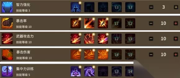 潜力 【智力强化】提供不错的智力加成,智力是木偶师的主属性,推荐加满。 【暴击率】【武器攻击力】【暴击伤害】三者是老常客了,几乎所有职业都需要点满。 【集中训练】点出第二格的增加吟唱类技能的伤害,木偶师吟唱类技能较多,推荐点出第二格即可。