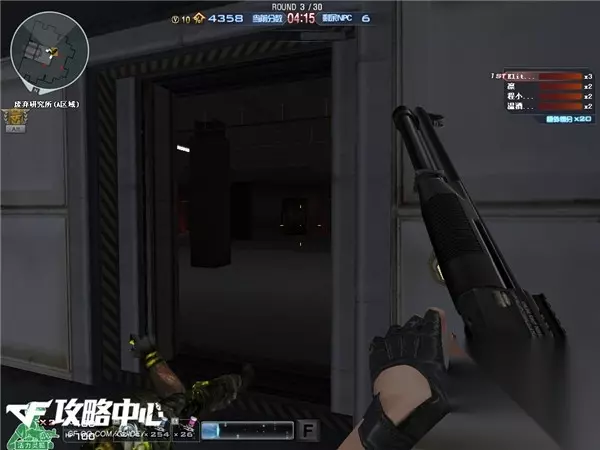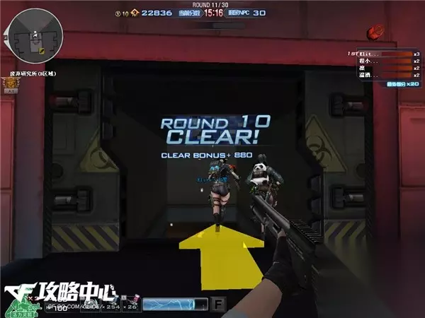 第一关,前方会有四个冲锋枪和两把xm1014可以拾取,建议至少有一个人拿xm1014以确保输出。剩下的四把冲锋枪是什么就要看运气了,uzi尽量不要用,mp5是最佳选择。 前几关我们的任务就是守住这个小房间,现在房间里有一个加子弹的地方和五个门,这几关的要点就是尽量不要让生化幽灵把门攻破。