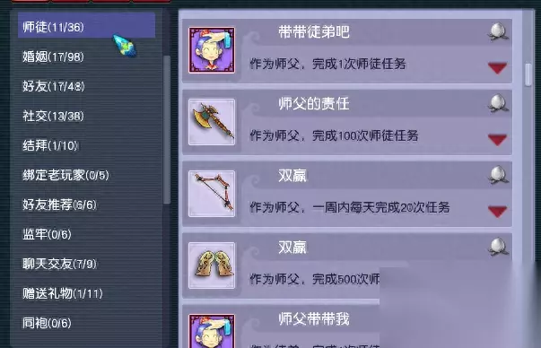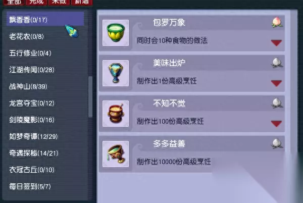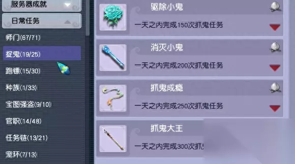 这里需要分几次刷,一次是单人满血挑战,可以带个洞冥草,等剩一个怪快没血的时候,给自己吃药补满血;一次是和等级相差10级内的队友挑战;一次是15回合内击败。 由于后面的剧情略有难度,69小号很难杀,这里至少也能拿到500左右的成就。 4、比较大块的就差不多了,剩下的都是日常任务的累积。比如师门任务相关的各种上交,抓鬼相关的次数,使劲肝。