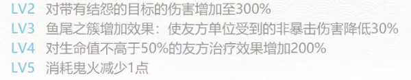 3、灵鱼抱蕊(3火) 唯一效果。使我方全体增加10%行动条,开启存在1回合的鱼尾之簇 (唯一效果),此期间,若自身未处于无法动作,友方单位回合结束后,治疗其攻击力50%的生命值,并对一名随机敌方单位造成攻击50%的间接伤害,优先攻击带有结怨的敌方,且此时伤害增加至攻击100%,之后消耗其身上的结怨。 唯一效果:若是有多个同名式神在场,只有一个式神的此技能会生效。 无法行动:受到控制效果中的冰冻、沉睡、眩晕、变形时、皆视为无法行动。 间接伤害:伤害类型的一种,不会触发御魂效果,无法被分担对防御为0的敌方必定暴击。