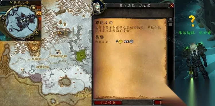 魔兽世界怀旧服WLK邪能之约任务流程攻略。不少玩家可能还不太清楚怀旧服中的这个任务如何完成,下面带来具体的攻略,供各位玩家们参考。 邪能之约任务流程攻略 接取等级:71 接取NPC:库尔迪拉·织亡者(龙骨荒野,阿格玛之锤) 完成NPC:库尔迪拉·织亡者(龙骨荒野,阿格玛之锤) 奖励声望:250点战歌远征军 任务开始: