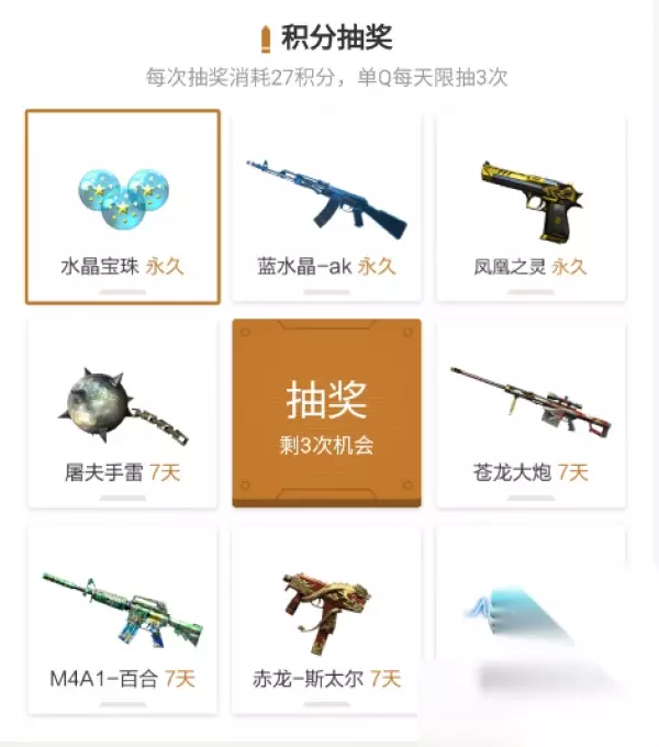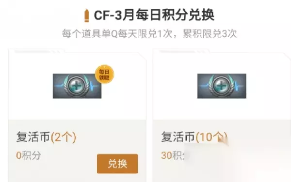 CF3月每日积分兑换,每个道具单Q每天限兑1次,累积兑3次