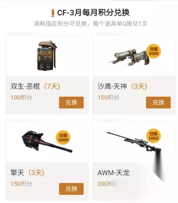 活动时间:即日起-3月31日 CF3月每月积分兑换,消耗指定积分可兑换,每个道具单Q限兑1次