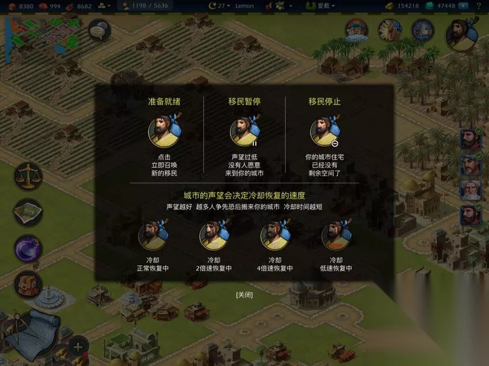 不同文明的高级城市,会显示不同特色的城市小图。例如25级以上的埃及城市,可以在城市小图上看到一个金字塔,而40级埃及城市则可以看到两个金字塔。25级以上的华夏是青瓦,35级以上的华夏是金瓦。可通过这种方式快速辨认城市。 6.邮件礼物:最常用的方法是,点击好友头像-赠送/索取。第二种方法是 点击货栈/粮仓-点击某种物资-赠送/ 索取。向好友赠送或索取的礼物,一次最多100担,不能重复索要或赠送同一个人相同物资。 每天只能赠送五封邮件礼物,只能接受两封邮件礼物。删除邮件并没有用,只要是当天好友赠送的礼物,即便尚未点击接收,都会算在当天两封的份额内。 例如我第一天送你两封武器的礼物,即便你没有领取,你也不能再接受更多礼物了。但是到第二天,你就可以继续接受其他礼物,即便前两封礼物你还是没有领取。 如果拒绝好友的礼物,礼物会被西统自动删除,不会再退回给好友。 货栈/粮仓没有多余空间时,无法索取物资,接到礼物邮件后也不能点击接受,只能在48小时内将货栈/粮仓空出储存再点击接受,超过48小时西统会自动销毁未接受礼物。 需要收获任务物资却爆仓没有空间时,可以给满邮件小号发送物资,以腾出储存空间收获任务物资,然后在48小时内再腾出空间收回系统自动退还的邮件物资。 7. 住宅:波斯满级普通住宅100个,别墅25个。华夏满级普通住宅100个,别墅35个。埃及和希腊满级普通住宅100个,别墅30个。小住宅满级10级,别墅满级6级。 住不满人,无法升级时,可以点击住宅,查看居民需要,点开旁边的ℹ️ 就能看到具体需要。建议将工厂远离住宅区。 例如住宅区显示居民需要可口的饭菜,点击旁边的ℹ️就能看到提示:修建粮店/菜店。再例如,显示居民想要有礼拜的地方,点开叹号就能看到修建礼拜堂/小清真寺的提示。 例如别墅区显示需要美化环境才会有更多居民涌入,这时可以紧贴别墅修建美化建筑(或自带美化功能、价格也最便宜的水井/饮水台),进来人后再把美化建筑铲了留出空地给其他建筑。 8. 四防 :华夏是三防,其他文明都是四防(概指防火、防盗、防病、防塌陷)。修建任何建筑之前,都要先建四防,有工人的地方都要覆盖到。 四防本身不需要互相覆盖,美化建筑也不需要四防覆盖。 宫殿、奇迹、未完成建筑没有四防也不会塌,但是任务要求全覆盖时还是要覆盖到。 人民突然变冷漠很大可能是哪里没有被四防覆盖到,这时可以 点 左下角查看城市概况 ,能看到代表四防的四个框。当框内右上角出现白色小图标时,点击图标会自动跳到倒塌建筑。如果建筑倒塌,但是有被维修站覆盖着,可以 点击倒塌建筑,查看倒塌原因(一般是其他三防没有覆盖到)。 如果建四防的工人不够,就拆了农田和工厂,直接用金币买入所需粮蔬。 四防引进工人后,因为断路不当 出现感叹号,不会影响四防正常运转,紧贴四防修建一格子死路即可。 9.美化:美化一般建在住宅旁边,尤其是别墅附近。美化不需要四防,但有时游戏出BUG,任务要求四防全覆盖,明明已经覆盖了还是没有显示完成任务,这时可以试试铲掉一两个美化建筑。 美化范围:1*1大小的美化建筑,美化范围是周围一圈。2*2大小的美化建筑,美化范围是周围两圈。可以根据周围道路的变化来看美化范围,因为美化建筑会让美化范围内的道路变得更漂亮。附近的工厂会减少美化范围。