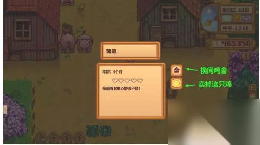 点击任意一只鸡,然后如下图所示的两个图标就是换鸡舍和卖鸡。换鸡舍首先要保证那间鸡舍有空位否则没法换,卖鸡是不可撤销的操作,要慎重考虑。
