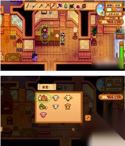 有了鸡舍后去骚扰牧场主玛尔妮,花钱买鸡。 鸡的颜色是随机的,一般不是黄色就是白色,女巫出现后可以养黑色的虚空鸡,和谢恩关系好可以获得蓝色母鸡。