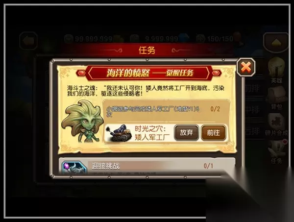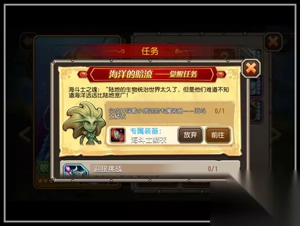 任务准备:触发任务 在开始任务前,请队长哥哥和小冰冰一起检查一下,英雄是否达到90级、是否进阶为橙色,这是英雄觉醒的必要条件喔!如果已经确认,请点击装备栏的问号,开启觉醒之旅。 任务准备:获得专属装备 点击问号后,将开启觉醒任务,请穿上专属装备。队长哥哥们请注意,不能同时为多位英雄进行觉醒任务喔,一旦开启就请完成吧!