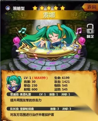 改版之前那白色的刀妹形象确实有点……惨不忍睹,改版之后的刀妹终于让人找到了“妹”的感觉,实在是可喜可贺。 刀妹的普通技能不仅可以造成物理伤害,还可以吸取比较可观的生命值,目前也是广大玩家非常喜欢的女英雄之一。队长技的强力眩晕也是单挑利器,很适合放在一条路上做单挑之用。 6、 索娜(外号:琴女)