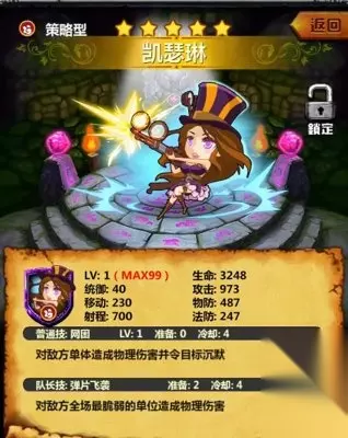 大家只看凤凰的技能说明就知道这个英雄有多牛X了吧,普通技能可以眩晕多个目标,最变态的是队长技能0冷却,也就是说在3个回合以后,凤凰就可以每个回合释放队长技,并且伤害也非常可观,再加上其进阶成橙色之后,本身的超高属性,绝对是PK的利器啊。唯一美中不足的是这家伙不是真实型攻击,对于一些法抗很高的英雄时有些力不从心。 3、 凯瑟琳(外号:女警)