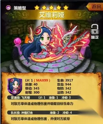 在后期的精英副本中,有不少建筑,并且技能伤害很变态,通常一个炮塔的普通攻击就能秒一片,所以光辉的队长技能对建筑的伤害非常可观,并且还是冲击波型,一下可以干一条路的敌人。普通技能的弹射眩晕也是先手制敌的利器,不论推图或者是PK都是一个非常不错的选择。 5、 艾维莉娅(外号:刀妹)