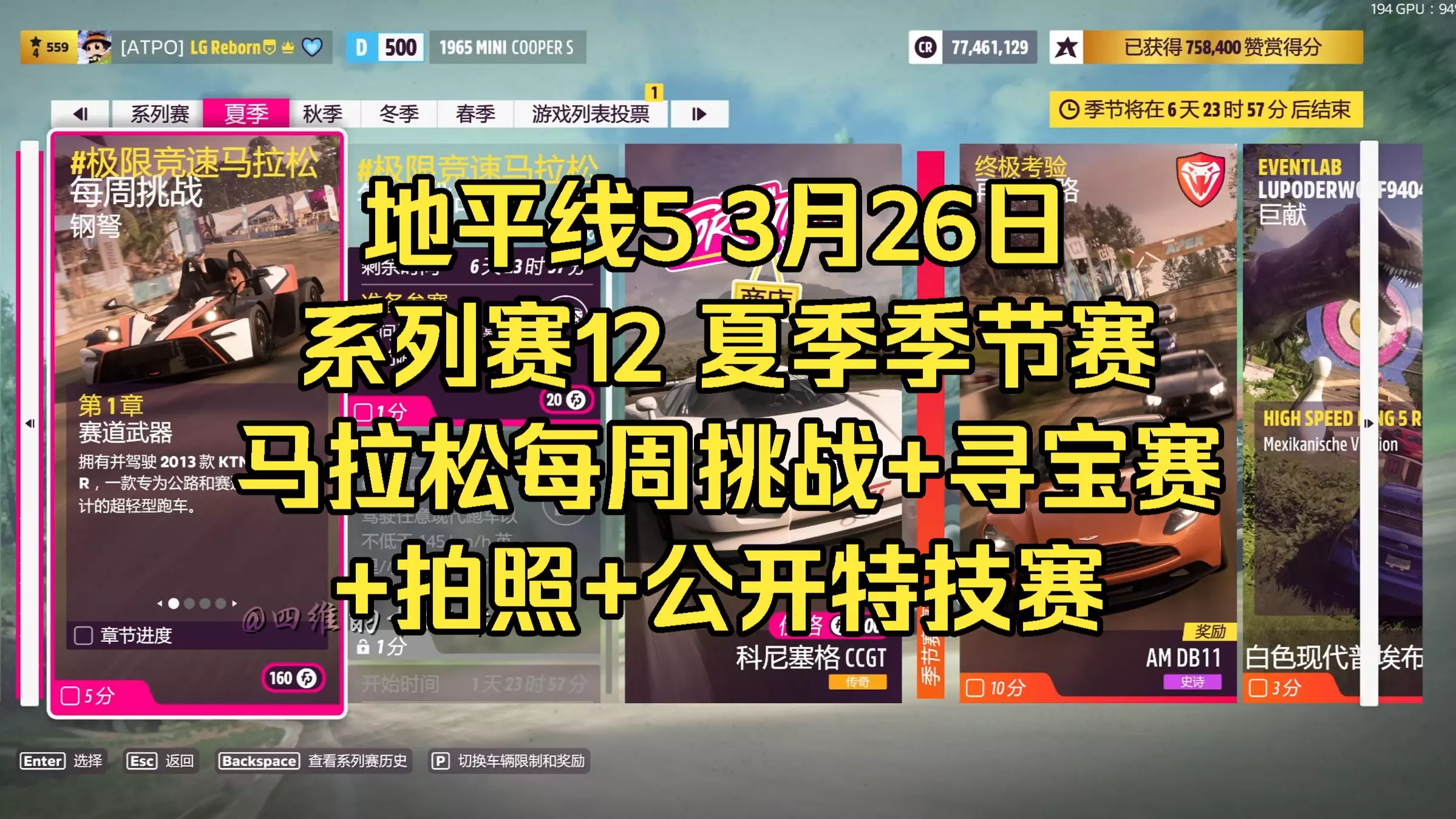 极限竞速马拉松 每周挑战 钢弩 必选车辆:KTM X-BOW R 2013 调校代码:207 427 394 (完成本周季节锦标赛 赛道玩具总动员可获得) 第二章:在任意测速照相累计获得12星等 打开地图手柄肩键RB筛选测速照相找到山腰,跑一次三星,跑四次即可,找不到的朋友参考图6并照做即可 第三章:完成5次空中飞车技术 空中飞车:四轮离地0.2秒即可达成1次 到地图西侧沙漠飞5次沙坡即可 第四章:打开菜单—创意中心—EVENTLAB—赛事蓝图 搜索蓝图代码:431 533 363 危险标志 酒店 推荐车辆:KOENIGSEGG JESKO 2020 调校代码:141 232 928 测速照相 海岸风光 推荐车辆:KOENIGSEGG JESKO 2020 调校代码:141 232 928 寻宝赛 快车道 推荐车辆:DODGE VIPER SRT 10 ACR 2008 调校代码:173 171 527 (拉力胎调校 易打滑,需提前松油门或刹车过弯) 驾驶任意赛道玩具赢得任意一场公路赛 注意:可设置最低难度 跑官图,别跑蓝图 完成后条件后,打开地图手柄肩键RB筛选季节赛宝箱 相片挑战 在地平线顶点前哨站处拍摄一张2013 Caterham Superlight R500的照片 推荐车辆:CATERHAM SUPERLIGHT R500 2013 手柄十字键上键拍照 DLC 拉力 测速照相 奥罗格兰德狂飙 推荐车辆:MOSLER MT900S 2010 调校代码:147 102 669 DLC 风火轮 漂移区域 涡轮结 推荐车辆:NISSAN SILVIA SPEC-R 2000 调校代码:152 262 573 终极考验 再次上路 推荐车辆:MERCEDES-BENZ E 63 AMG 2013 调校代码:168 177 089 (直线胎调校 直线快 侧G低) EVENTLAB (可设置最低难度) 推荐车辆:JAGUAR XKR-S 2012 调校代码:111 531 129 季节锦标赛 迎战巨汉 推荐车辆:FERRARI 812 SUPERFAST 2017 调校代码:156 245 532 (拉力胎调校 易打滑,需提前松油门或刹车过弯) 季节锦标赛 公路耐力赛 推荐车辆:HSV GEN-F GTS 2014 调校代码:895 944 494 季节锦标赛 赛道玩具总动员 推荐车辆:DODGE VIPER SRT 10 ACR 2008 调校代码:173 171 527 (拉力胎调校 易打滑,需提前松油门或刹车过弯) 季节锦标赛 GT赛 推荐车辆:JAGUAR XKR-S 2012 调校代码:111 531 129 DLC 拉力 季节锦标赛 时间错位 推荐车辆:FORD COSWORTH RS500 1987 调校代码:134 777 662 DLC 风火轮 季节锦标赛 橙色赛道思维 推荐车辆:MOSLER MT900S 2010 调校代码:147 102 669