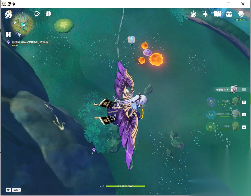 第一个在低处的山崖上,从传送点跳下去滑翔过去,可以看到亮起的箭头,还有一大两小三个火史莱姆围着的一个会造成草元素范围伤害的三相众物蘑菇。 游戏指导和加载界面说,有些三相众物受到雷元素会发出“真识波”,使周围隐藏的事物显现出来。三相众物有很多,除了这个蘑菇,旁边那个弹跳蘑菇、藤蔓缠绕的方形石头、空中飘荡的种子状事物等都是。都有正常、活化、枯焦三种状态。
