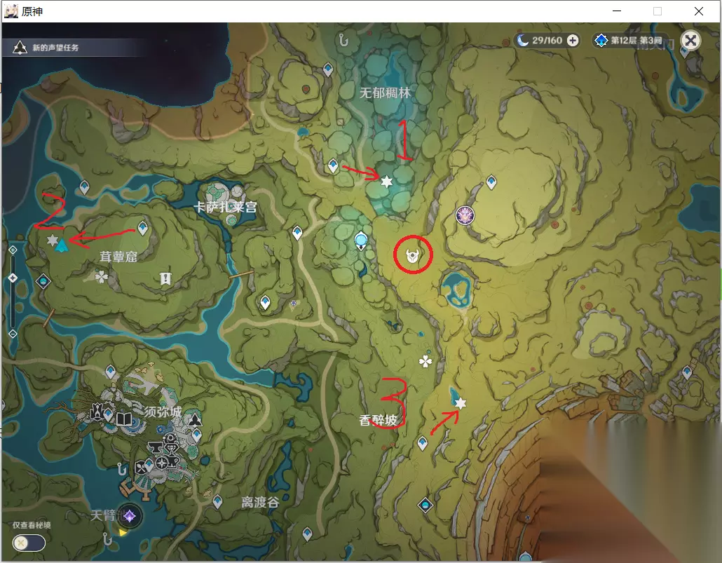 传送到无郁稠林旁边的神像,从有体力花的地方爬上去,一朵可以加100体力,所以不用省体力。