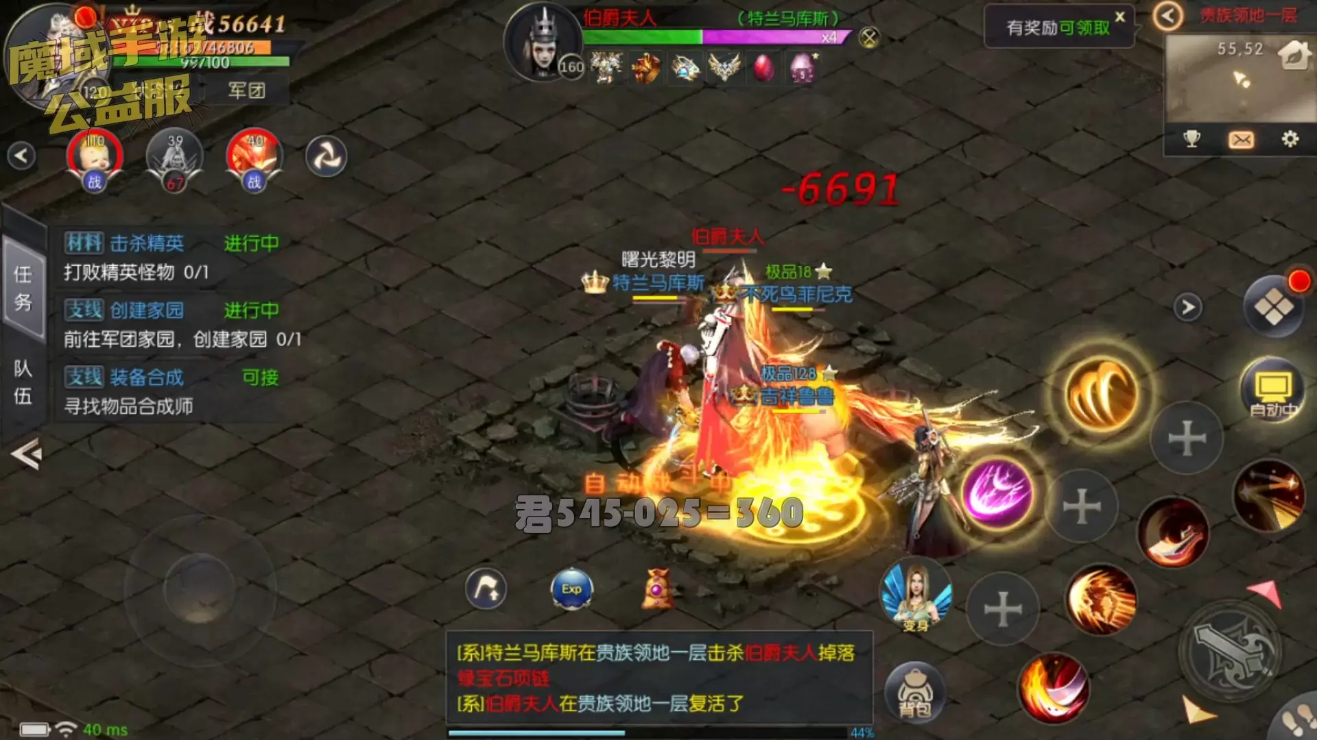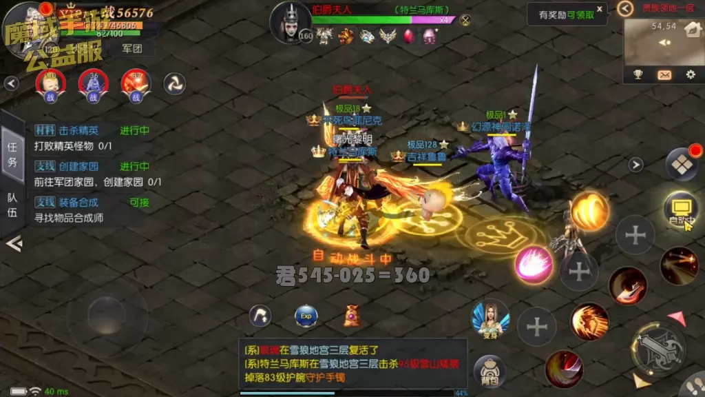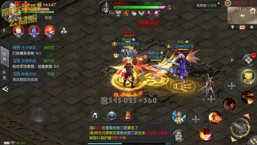 这是魔域手游公益服的游戏展示,画面呈现了玩家在无尽挑战副本中自动战斗的场景,当前波数1/65,还有经验收益,同时还能看到击杀怪物掉落装备的提示,展现了魔域怀旧服的战斗玩法。