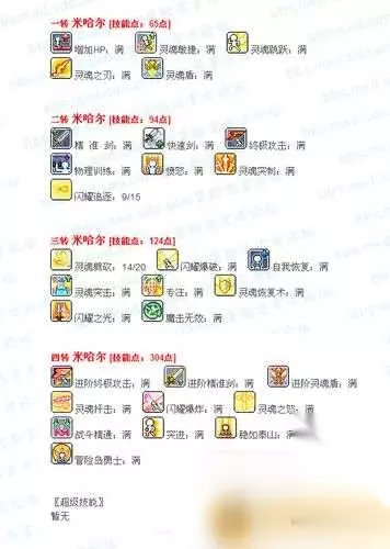 小面来和颠沛了灼心一起来看看关于冒险(adventure)岛米哈尔技能加点和属性加点的详细内容。 冒险(adventure)岛米哈尔技能加点和属性加点: 你好 米哈尔属于战士系,主属性为力量,由于战士系装备没有副属性要求(仅小部分需要),加点建议全力加点,敏捷只加23 米哈尔技能加点: 冒险(adventure)岛V104带的神秘职业原来是米哈儿,代表骑士团的200级高级职业米尔哈属性技能加点小编现在就奉献给大家。由于米哈尔是战士系职业,所以属性加点应该是主力副敏。 标准加点是999L和23M 新手技能: 光的守护者:90秒内被攻击时100%不后退-Link技能 冷却300秒(意义不大) 下面是技能加点: 一转:(共61点) 灵魂之盾:15点满。永久增加防御,魔防200 必满。(四转需要这个前置) 生命强化:10点满,永久提高HP20% 必满 灵魂敏捷:10点满,增加200命中,25的速度和20的跳跃。条件灵魂之盾1点 必满 灵魂跳跃:10点满,消耗10点MP,向前跳跃一段距离 必满 灵魂之刃:20点满,过度技能 加16点 二转:(共121点) 剑精通:20点满,增加熟练度50% 命中+60 必满,不解释 快速剑:20点满,200秒提高攻击速度2个等级 必满,不解释 愤怒之火:20点满 必满,不解释 物理训练:10点满,永久增加30点力量和敏捷 必满。 终极剑:20点满,40%概率追加攻击150%伤害 必满不解释 突进:20点满,对6个怪物发动380%攻击 这个和灵魂突刺可以取舍,不过后期突进比突刺好用,建议加满 灵魂突刺:20点满。对6个怪发动4次145%攻击 取舍在突进之间。个人觉得突进比较实在,这个是过度技能建议+11 三转:(共151点) 灵魂属性:10点,300秒追加130%伤害 必满不解释 圣魂之盾:20点,180秒内增加防御100%所有属性抗性异常状态抗性60% 必满,不解释 魔击无效:20点满 神技不解释必满 战斗意识:20点满,永久增加力量40,攻击速度提升1个等级 也是神技,必满 灵魂攻击:20点满,攻击异常怪物伤害增加20% 暴击增加20% 必满。不解释 血魔恢复:30点满。每4秒恢复150HP,90MP 刷到场有用,觉得对自己有用就加没用可以舍弃。舍弃这个可以满3转的2个攻击技能 勇猛劈砍:20点满,对4个怪物发动3次230%攻击 取舍在血魔恢复之间 灭光波:20点满,对6个怪物发动3次270%的攻击 必满。(四转技能的前置) PS:劈砍,灭光,血魔恢复,三者看自己嗜好取舍 四转:(共241点) 进阶灵魂之盾:30点满,减少伤害20%,需要灵魂之盾15点 必满 剑专修:30点满,增加熟练度70%,攻击+30,暴击最小伤害+15%需要剑精通20点 必满,不解释。 进阶终极攻击:30点满,60%概率追加2次250%的攻击,攻击+30 必满,不解释 灵魂之怒:30点满。240秒内攻击增加60%,暴击增加20%,最小暴击伤害增加15% 必满不解释 战斗精通:10点满,无视防御40% 必满不解释 稳如泰山,30点满 必满不解释 气功波:30点,对6个怪发动4次380%攻击 群攻主技能,必满 灵魂穿刺:30点满,对1个怪物发动4次290%攻击,10%晕6秒 单攻主技能,必满 冒险(adventure)岛勇士:30点满 量力而行 勇士意志:5点满 推荐最低加3点 总结:以上内容就是针对冒险(adventure)岛米哈尔技能加点和属性加点的详细介绍(Introduction),大家可以参考一下。 夜芹小编为大家介绍(Introduction)的关于【米哈尔技能加点 冒险(adventure)岛米哈尔技能加点和属性加点】相关内容,不知道是否解决了妩媚玩家的疑问。如果您还有其他游戏问题,请持续关注我们的手游问答栏目或在后台留言,我们将一一为您解答
