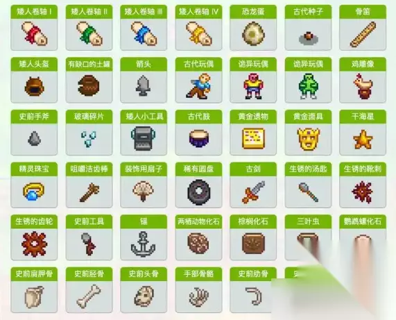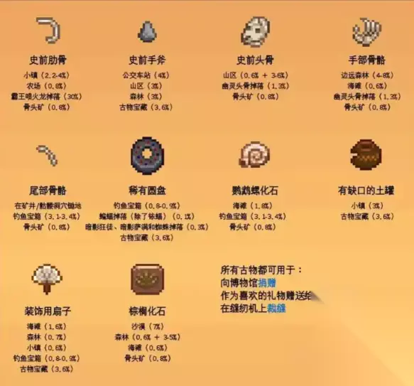 获取途径 可以通过以下途径获得文物: 使用锄头锄开远古斑点。地图上不同的位置散落着不同的文物。远古斑点在冬天更为常见。 使用锄头锄开矿井和头骨山洞的淤泥。 怪物概率掉落。 钓鱼时出现的宝箱。 在克林特处打开古物宝藏。 捐赠奖励 捐赠以下的文物会给予玩家独特的奖励: 将古代种子捐赠给博物馆,博物馆不仅将奖励玩家古代种子制造配方,还可以奖励一包上古种子,将其种下后可以收获上古水果。 若是捐赠出全部的四卷矮人卷轴(包括矮人卷轴 I,矮人卷轴 II、矮人卷轴 III、矮人卷轴 IV)则玩家可以获得《矮人语教程》,这之后可以和矿井中的矮人交流。 若是捐赠了古代鼓,那么博物馆将会奖励玩家一个鼓块。 若是捐赠了骨笛,那么博物馆将会奖励玩家长笛块。 若是捐赠了鸡雕像,那么博物馆将会奖励玩家一个鸡雕像(家具)。 若是捐赠了史前骨头碎片,包括(史前肩胛骨、史前头骨、手部骨骼、史前肋骨、史前脊骨、尾部骨骼)那么博物馆将会奖励玩家树懒骷髅的部件。 若是捐赠了稀有圆盘,那么博物馆将会奖励玩家“火祭品”。 恐龙蛋和普通的蛋一样,可以在鸡舍中孵化出一个恐龙,当其完全长大后,可以产出更多的恐龙蛋。