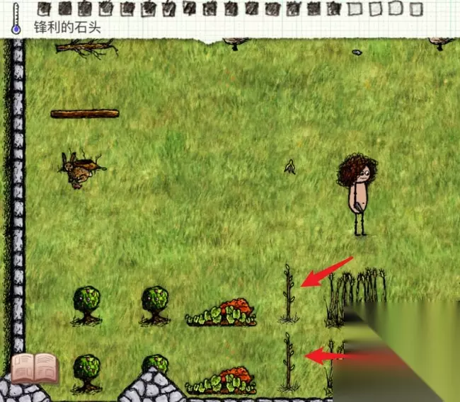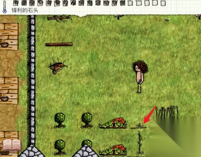3、然后使用尖石划过小树苗,即可获到木签并捡起。