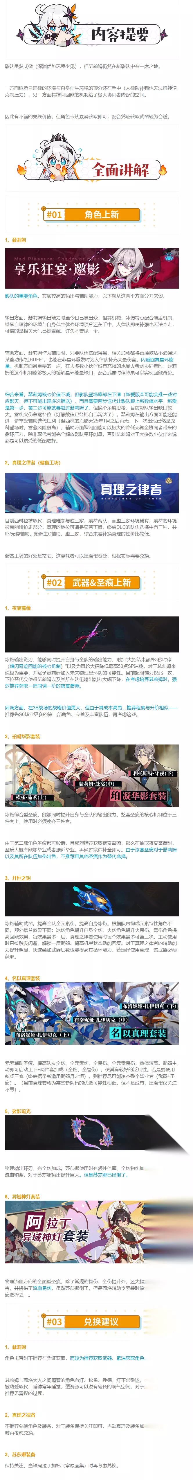 影队虽然式微(深渊优势环境少见),但瑟莉姆仍然在新影队中有一席之地。一方面继承自理律的环境与自身伴生环境的顶分还在手中(人律队补强也无法扭转逆克制压力),另一方面其蹭闪回能的机制给了极大协同者降配的空间。因此有不错的兑换价值,但角色卡从累消获取即可,配合凭证获取武器较为合适。