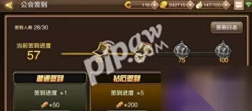 5、每天可以签到公会一次,可以选择不同的签到方式,有普通签到、钻石签到、白金签到,那么有什么区别呢?如果是普通签到只需要金币,其他都需要龙币签到,签到可以获得公会贡献,一定的进度可以领取丰盛的奖励哦。 6、公会活跃度:需要公会19级开放。